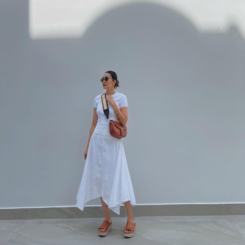 Item này thường xuất hiện trong các set đồ tối giản. Khi kết hợp với áo cùng tông hoặc màu pastel, chân váy trắng mang lại vẻ dịu dàng, nữ tính. Ngược lại, nếu phối cùng áo màu đậm hoặc họa tiết nổi bật, nó sẽ đóng vai trò cân bằng, giúp tổng thể hài hòa và không bị rối mắt.