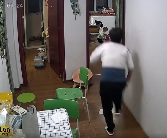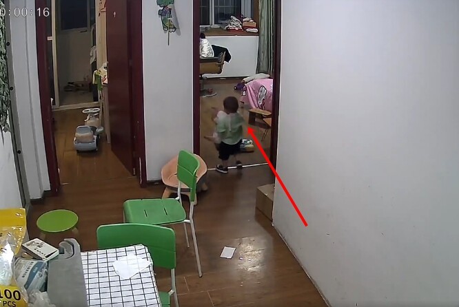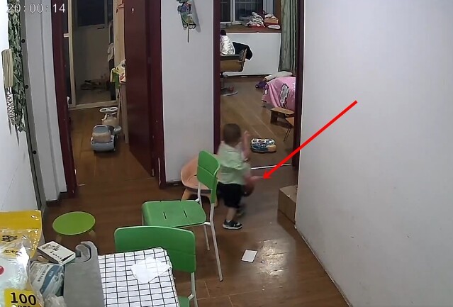 Theo đó clip được cắt từ camera giám sát phòng khách của một gia đình tại Trung Quốc. Bắt đầu bằng cảnh tượng một bé trai chừng hơn 1 tuổi đang ngồi chơi với em trong một phòng ngủ, mẹ bé ngồi làm việc ở một phòng ngủ khác và một người phụ nữ khác là bà đang ở khu vực bếp nấu của gia đình.