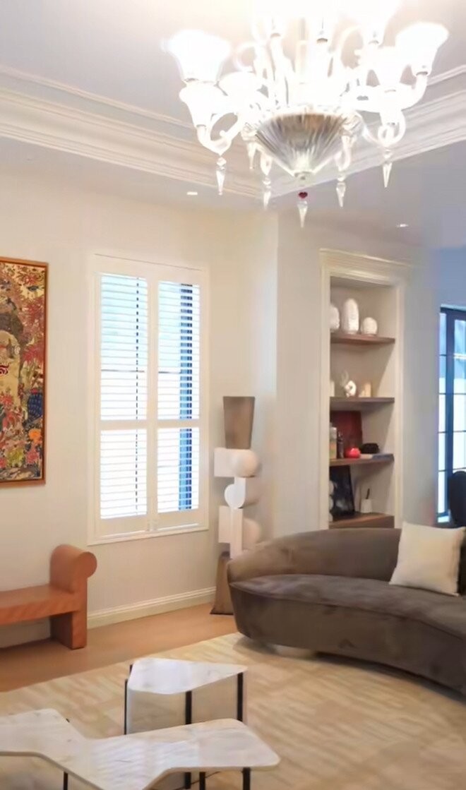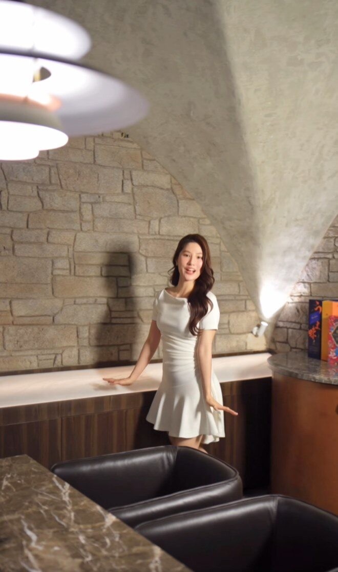 Bên trong biệt thự trắng còn có một hầm rượu vang được thiết kế như hang đá, với trần vòm uốn cong, tường ốp đá thô và ánh sáng hắt nhẹ tạo cảm giác ấm cúng. Một chiếc bàn đá lớn đặt ở trung tâm, xung quanh là ghế bọc da tối màu – vừa đủ riêng tư để tiếp bạn thân, vừa mang chất "chill" rất điện ảnh.