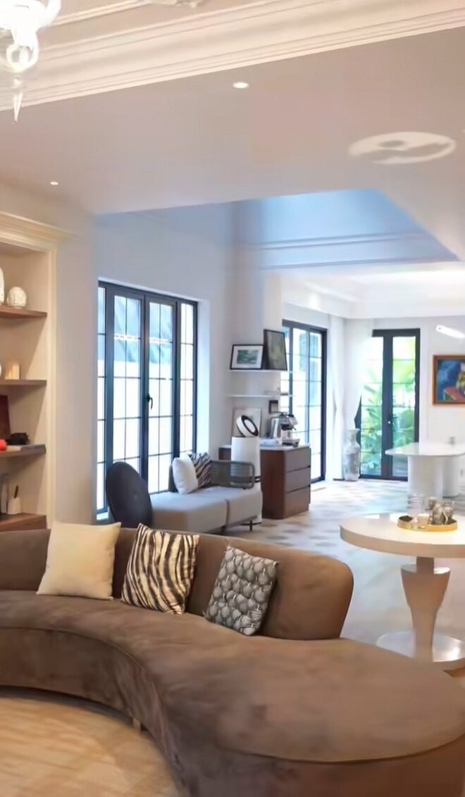 Phòng khách rộng rãi với sofa nhung cong mềm mại. Ánh sáng tự nhiên len lỏi qua các khung cửa kính lớn. Mọi chi tiết đều hướng đến sự thư giãn và gần gũi, đúng tinh thần của một tổ ấm hiện đại.