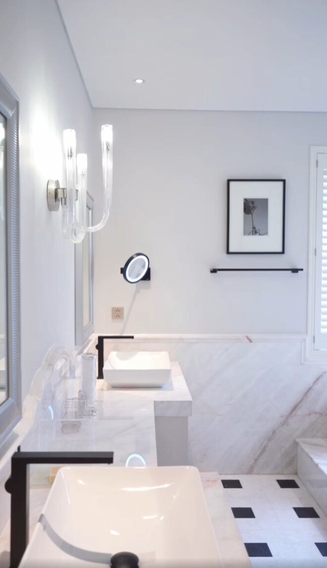 Phòng tắm giữ sự đồng bộ về màu sắc trắng tinh khiết, nền đá marble nhẹ nhàng, ánh sáng bố trí vừa đủ. Không gian riêng tư vẫn được chăm chút chỉn chu.