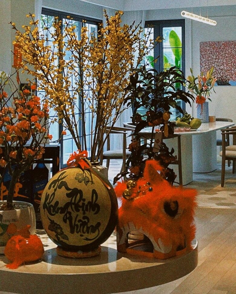 Vào những dịp đặc biệt, không gian trung tâm của biệt thự được tô điểm thêm bằng hoa đào, mai, và các món đồ trang trí mang hơi thở văn hóa truyền thống, nhưng vẫn giữ được sự tinh tế trong tổng thể kiến trúc phương Tây.