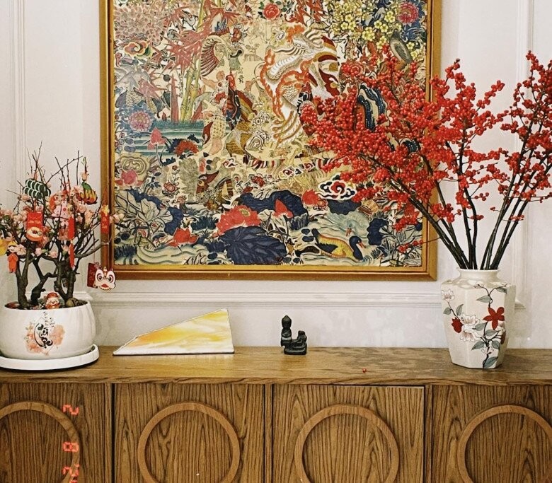 Một góc trang trí trong nhà nổi bật với tủ gỗ tròn họa tiết và tranh dân gian đầy màu sắc. Không gian kết hợp giữa truyền thống và hiện đại tạo cảm giác gần gũi, ấm áp, đặc biệt trong những dịp lễ Tết.