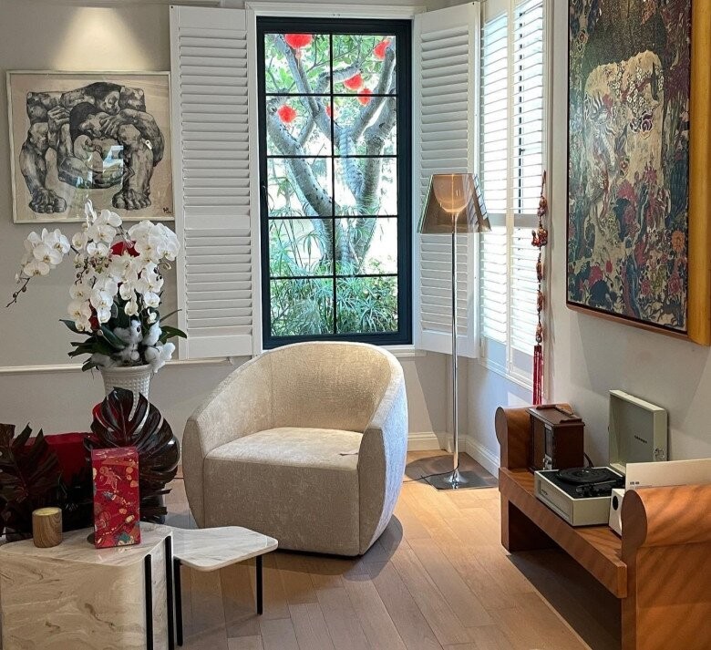 Một góc nhỏ gần cửa sổ được tận dụng làm nơi đọc sách hoặc thư giãn. Ghế đơn bọc vải nỉ sáng màu, bàn trà đá vân mây và cửa chớp trắng mang lại cảm giác nhẹ tênh, riêng tư mà không bị tách rời khỏi tổng thể. Mọi chi tiết đều rất tinh tế và nên thơ, đủ để mỹ nhân của điện ảnh Việt luôn cảm thấy thư giãn trong ngôi nhà hạnh phúc của mình.