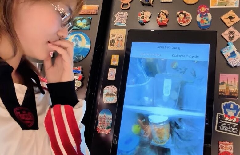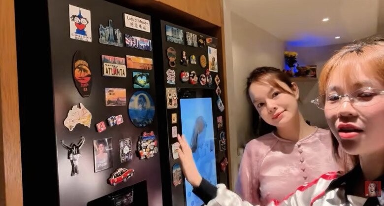 Chi tiết đắt giá và gây chú ý nhất trong căn bếp chính là chiếc tủ lạnh Side-by-side hiện đại. Đây không chỉ là một thiết bị bảo quản thực phẩm mà còn là một "cuốn nhật ký hành trình" của nữ ca sĩ.