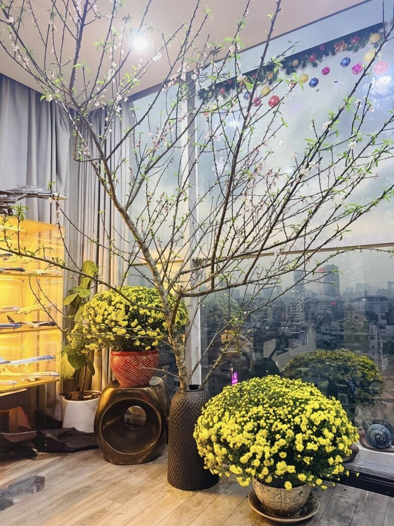 Không gian phòng khách nhà nữ BTV mở ra sự khoáng đạt với ánh sáng tự nhiên, nay thêm những mảng màu rực rỡ của đào quý và các loại hoa xuân.