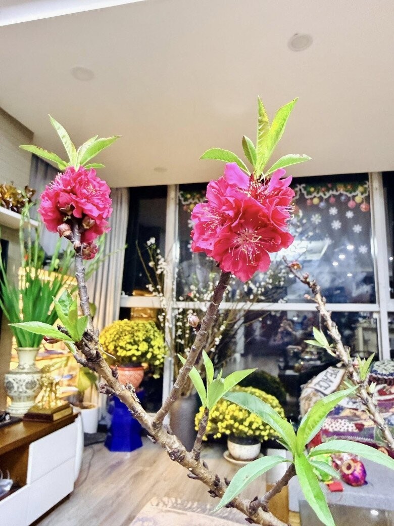 Sắc đỏ nhung rực rỡ của những bông đào thất thốn mọc thành chùm hiếm có, tạo nên điểm nhấn vương giả và ấm cúng cho không gian.
