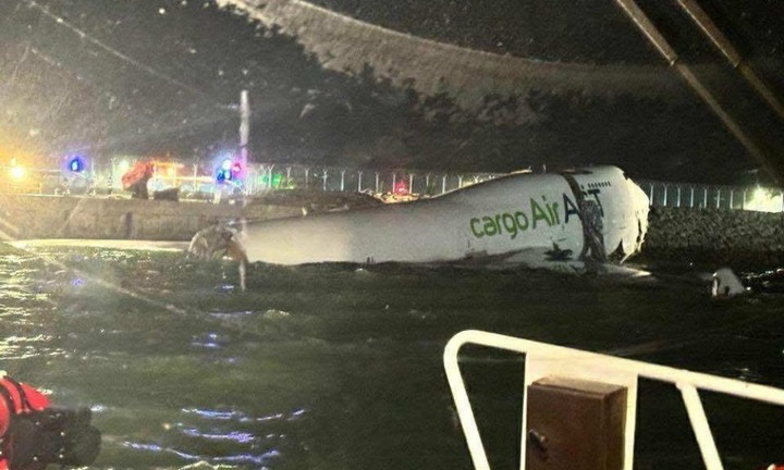 Chiếc Boeing 777 chở hàng không kịp dừng và lao một phần thân xuống vùng nước ngoài rìa phía Bắc sân bay.