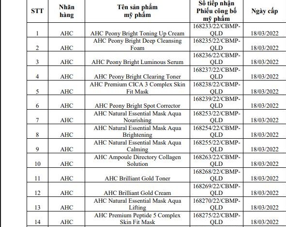 Trong số này có nhiều mỹ phẩm quen thuộc trên thị trường Việt Nam, thuộc các nhãn hiệu như AHC, REN, Cellabel, LHALALA, KOMI, SAKURA, VANTMED...