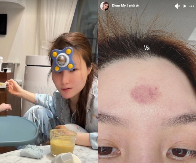 Mới đây, Diễm My 9X đã chia sẻ lên Facebook cá nhân những khoảnh khắc chăm sóc quý tử đầu lòng. Dù làm dâu hào môn, nữ diễn viên vẫn tự mình nuôi con thay vì nhờ sự hỗ trợ từ bên ngoài. Trong lúc cho quý tử ăn dặm, người đẹp 9X đã mang 1 món đồ chơi trước trán để thu hút sự chú ý của bé. Kết quả là sau khi nhóc tì dùng bữa, phần đầu của cô cũng bị bầm tím.