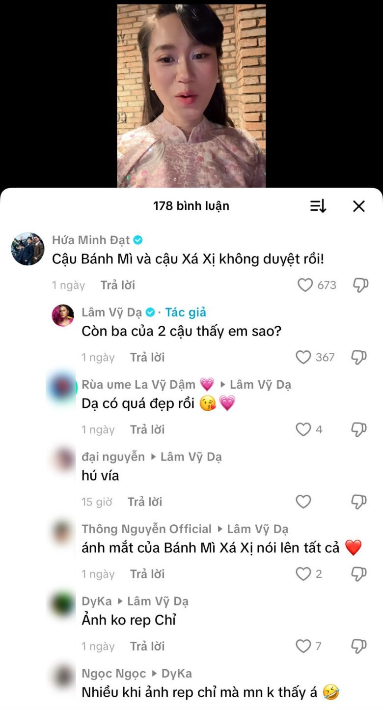 Theo đó, Lâm Vỹ Dạ thực hiện thử thách nhảy trước mặt hai con trai Xá Xị và Bánh Mì, đồng thời gắn thẻ tên chồng Hứa Minh Đạt để hỏi "Cậu ba thấy em đẹp chưa?".