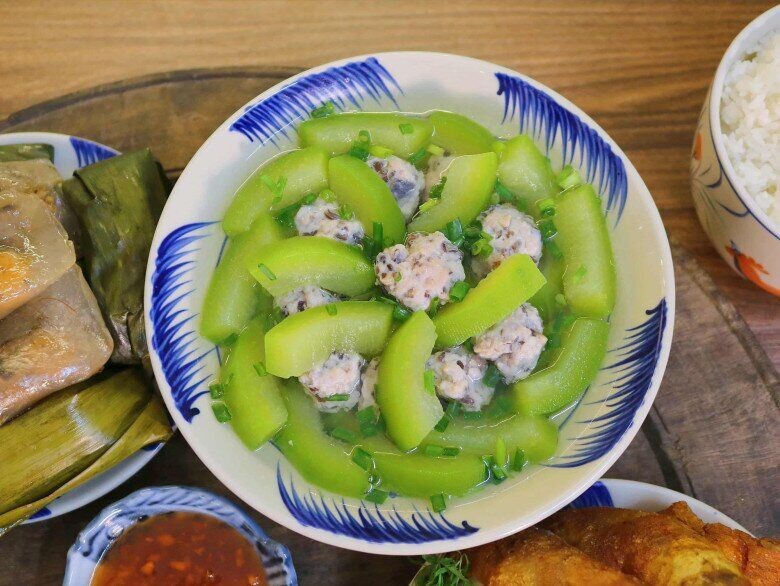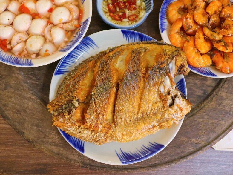 Mâm cơm dân dã mà tròn vị với cá rô phi rán vàng ruộm, thơm giòn bên ngoài, ngọt mềm bên trong. Canh bí đao nấu mọc thanh mát, dịu nhẹ. Ngồng cải sốt dầu hào đậm đà, xanh giòn. Trứng tráng ngải cứu bùi béo, thoảng hương quê nhà, đủ đầy cho bữa cơm sum vầy.