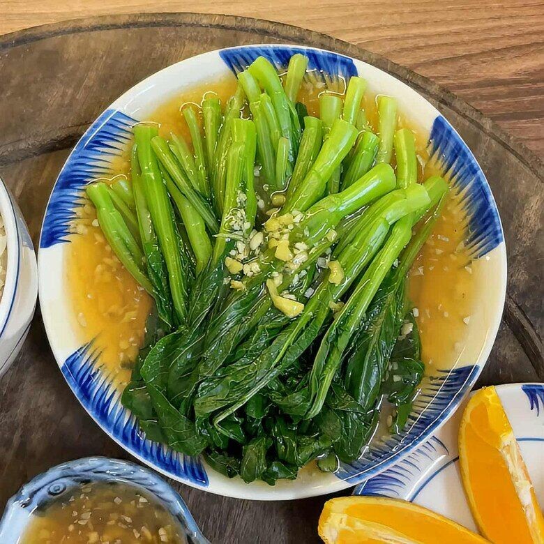 Làm nước sốt xào: Cho dầu hào, nước tương, đường, tinh bột và một chút nước vào bát khuấy đều. Đun sôi một nồi nước có thêm chút muối và dầu mè, rồi thả rau cải vào luốn chín tới, vớt ra để lên đĩa sâu lòng. Nước luộc cho thêm muối và dầu mè để giữ cho rau cải có màu xanh đẹp mắt, thơm và bóng. Hành tỏi băm nhuyễn, cho một ít dầu ăn vào chảo, đun nóng rồi phi tỏi băm cho thơm.