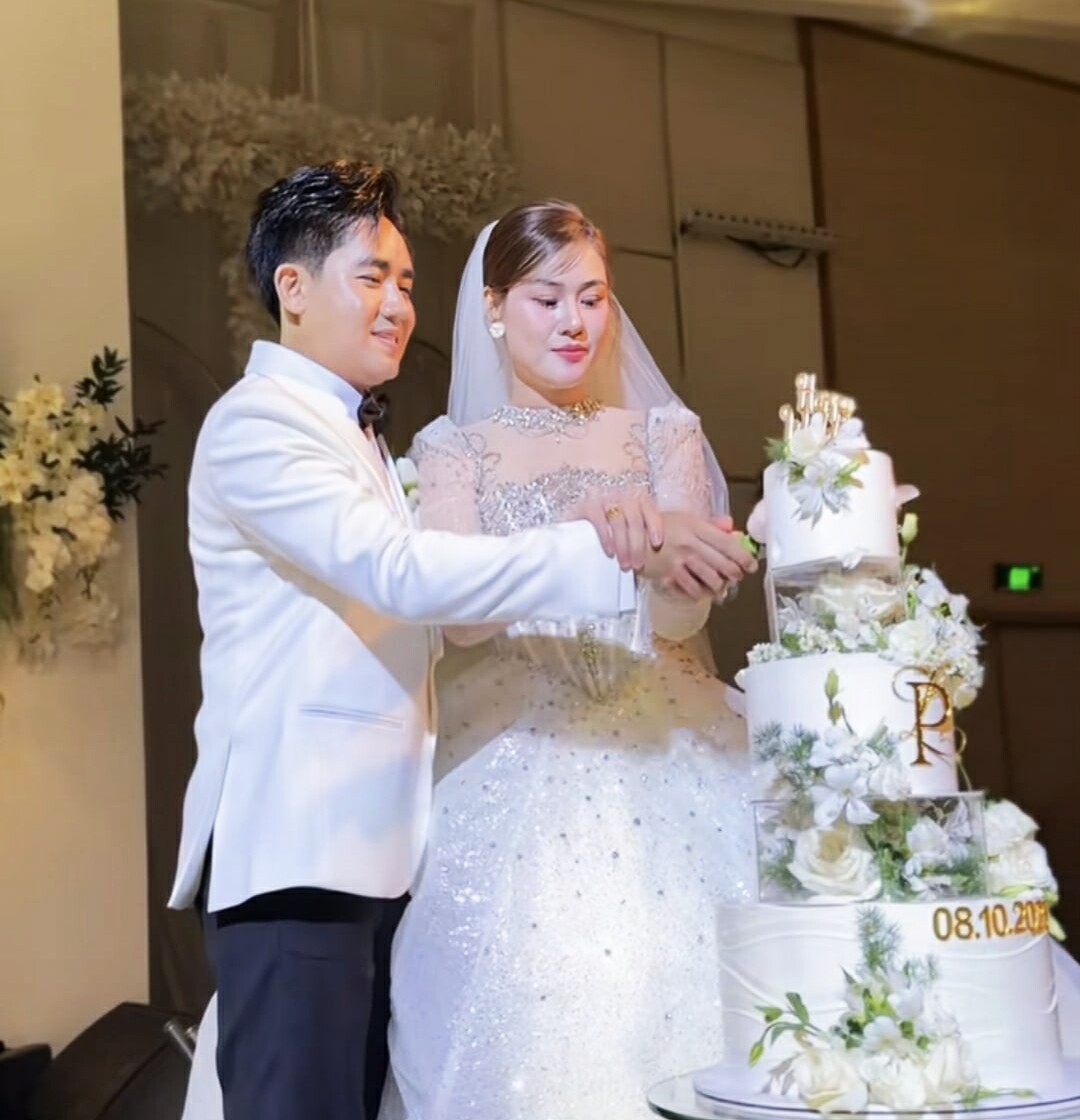 Cặp đôi thực hiện nghi thức cắt bánh cưới.