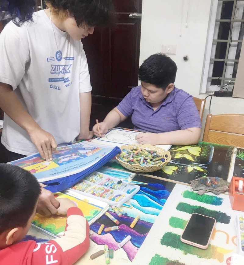Khi con được khoảng 9 tuổi, chị phát hiện con ở nhà rất hay vẽ và có thể vẽ lên bất cứ thứ gì xung quanh. Điều đặc biệt là đó không phải những nét vẽ nguệch ngoạc mà có hình dáng rõ ràng và rất bắt mắt. Chị đưa con tới trung tâm và được thầy giáo động viên nên cho con học vì bé có năng khiếu hội họa.
