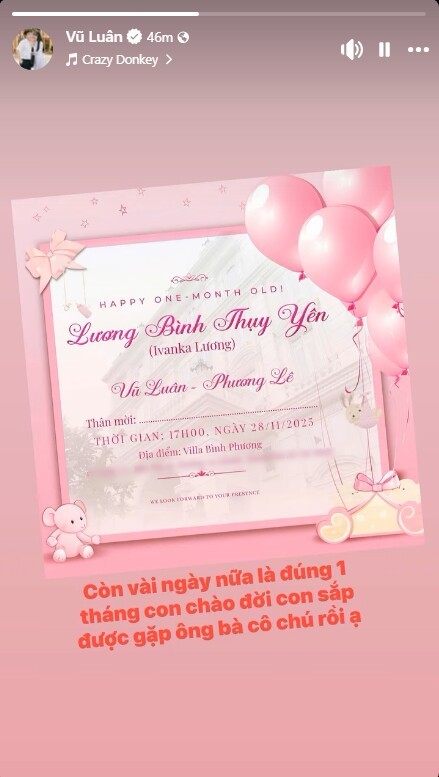 Mới đây, NSƯT Vũ Luân đã chia sẻ thiệp mời gửi đến bạn bè, người thân tham dự tiệc đầy tháng của ái nữ. Trong tấm thiệp, nam nghệ sĩ tiết lộ tên thật của con gái là Lương Bình Thụy Yên và tên thân mật là Ivanka Lương.