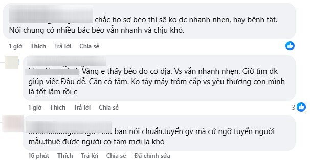 Một số phụ huynh yêu cầu người giúp việc không quá béo không phải vì thẩm mỹ mà vì tính chất công việc. Người chăm trẻ cần bế bồng, chạy nhảy, theo sát trẻ liên tục. Một thể trạng quá nặng nề có thể khiến họ khó linh hoạt, phản ứng chậm khi trẻ gặp tình huống nguy hiểm. Ngoài ra, nhiều người cho rằng hình ảnh người chăm sóc gọn gàng, nhanh nhẹn sẽ tạo ấn tượng tốt và giúp trẻ học theo sự năng động đó.