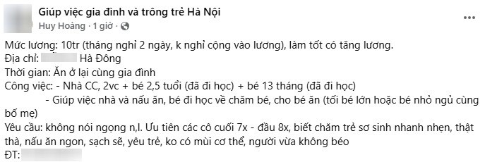 Theo đó, một ông bố sinh sống tại khu vực Hà Đông, Hà Nội đăng tuyển giúp việc gia đình với công việc chính là chăm sóc 2 con nhỏ đang trong độ tuổi mẫu giáo, bên cạnh đó giúp việc nhà và nấu ăn. Ông sẵn sàng chi trả mức lương khá cao so với trung bình hiện tại ở nhiều gia đình khác, 10 triệu/tháng.