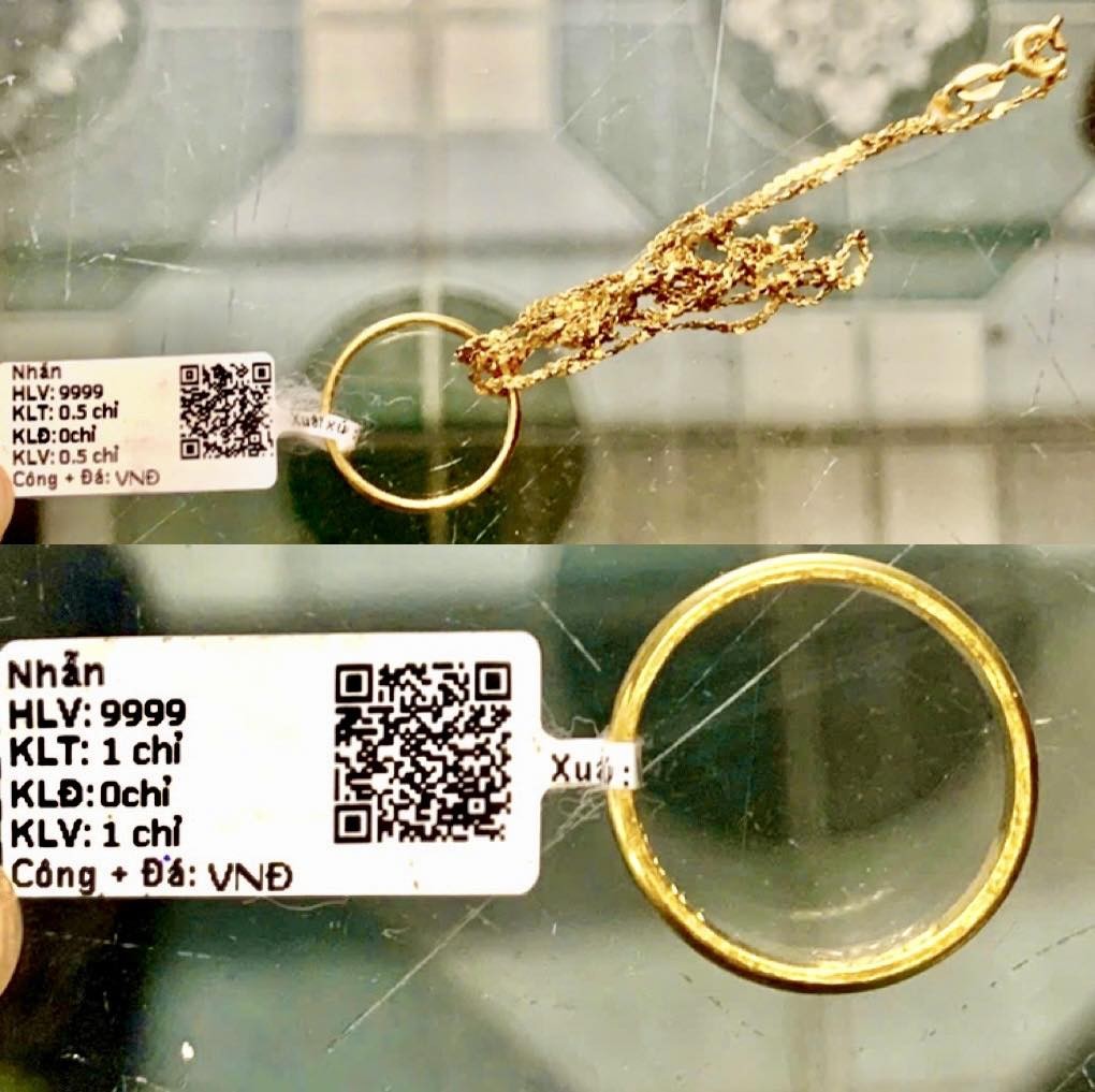 Bên trong túi xách có một chiếc ví màu đen may hoa văn thổ cẩm. Trong ví có một hộp màu đỏ đựng 2 chiếc nhẫn vàng 9999, một dây chuyền vàng cùng một số đồ dùng cá nhân.