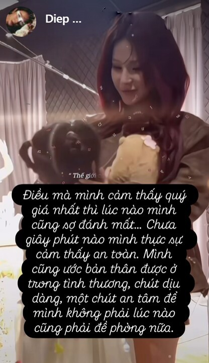 Mới đây, Diệp Lâm Anh đã có chia sẻ đáng chú ý trên mạng xã hội. Theo đó, người đẹp đăng tải đoạn video ôm con gái đầu lòng và viết dòng chú thích tâm trạng. Cô thừa nhận chưa có giây phút nào thực sự cảm thấy an toàn. Diệp Lâm Anh viết: "Điều mà mình cảm thấy quý giá nhất thì lúc nào mình cũng sợ đánh mất. Chưa giây phút nào mình thật sự cảm thấy an toàn. Mình cũng ước bản thân được ở trong tình thương, chút dịu dàng, một chút an tâm để không phải lúc nào cũng đề phòng nữa".