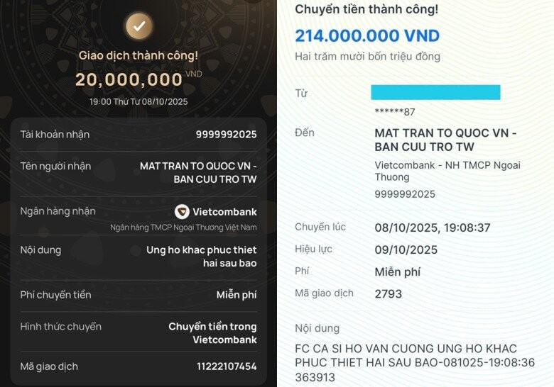Đi kèm bài đăng là hình ảnh xác nhận số tiền quyên góp, gồm 20 triệu đồng của Hồ Văn Cường và 214 triệu đồng đến từ FC của anh trên khắp cả nước. Toàn bộ số tiền đã được gửi đến tài khoản của Ủy ban Mặt trận Tổ quốc Việt Nam nhằm hỗ trợ bà con bị ảnh hưởng bởi mưa bão, giúp khắc phục hậu quả và ổn định cuộc sống.