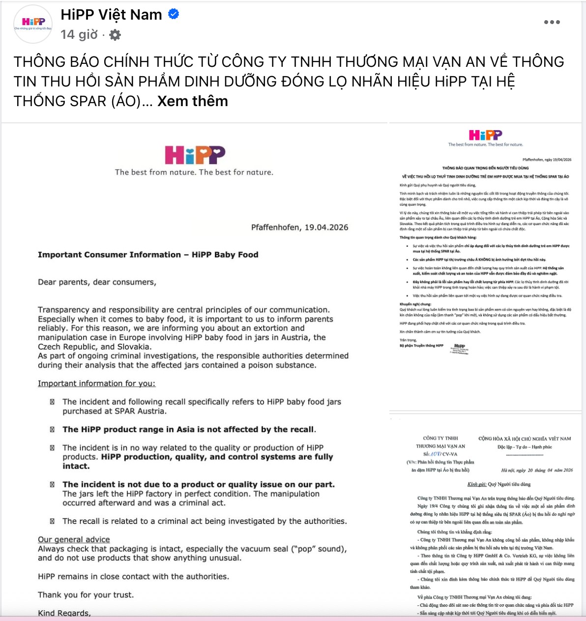 Theo nội dung thông báo, ngày 19/4/2026, doanh nghiệp ghi nhận thông tin về việc một số sản phẩm dinh dưỡng HiPP được phân phối tại hệ thống siêu thị SPAR (Áo) bị thu hồi do nghi ngờ có sự can thiệp từ bên ngoài, liên quan đến vấn đề an toàn sản phẩm.