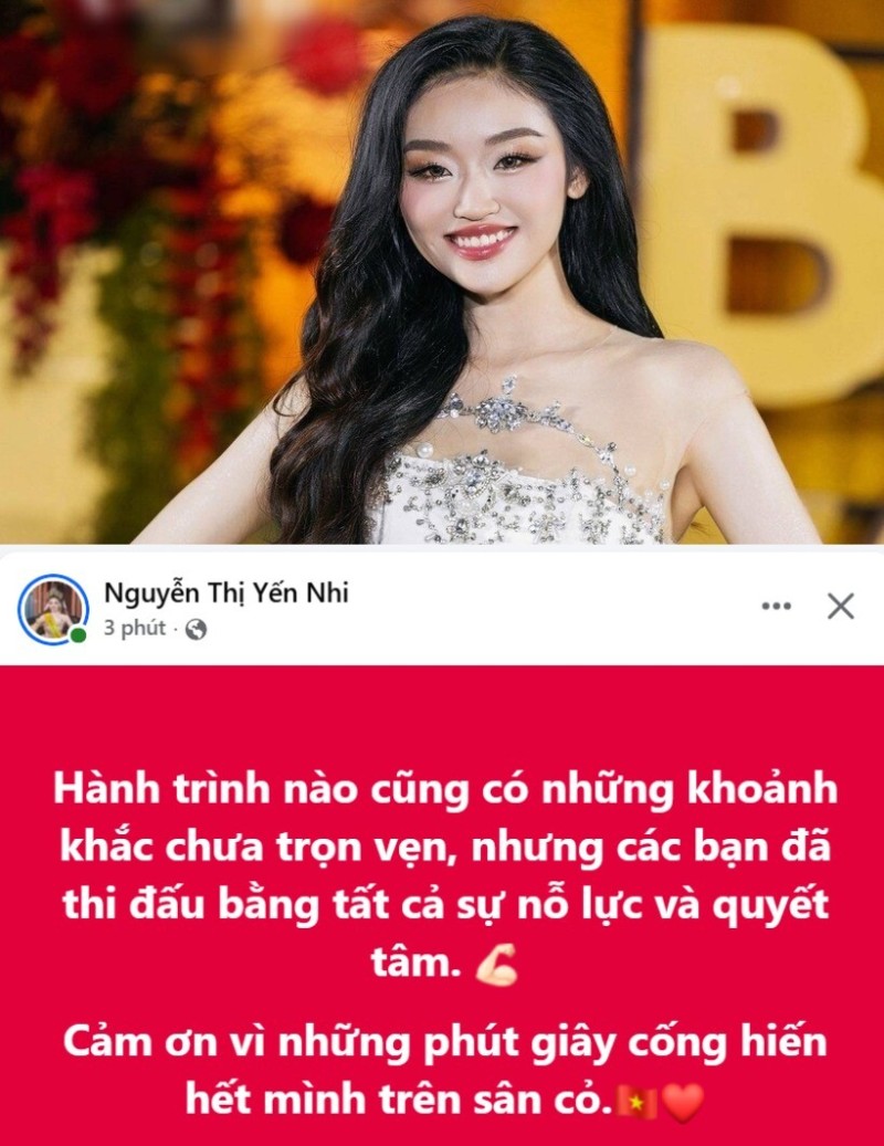 Hoa hậu Yến Nhi chia sẻ: "Hành trình nào cũng có những khoảnh khắc chưa trọn vẹn, nhưng các bạn đã thi đấu bằng tất cả sự nỗ lực và quyết tâm. Cảm ơn vì những phút giây cống hiến hết mình trên sân cỏ".