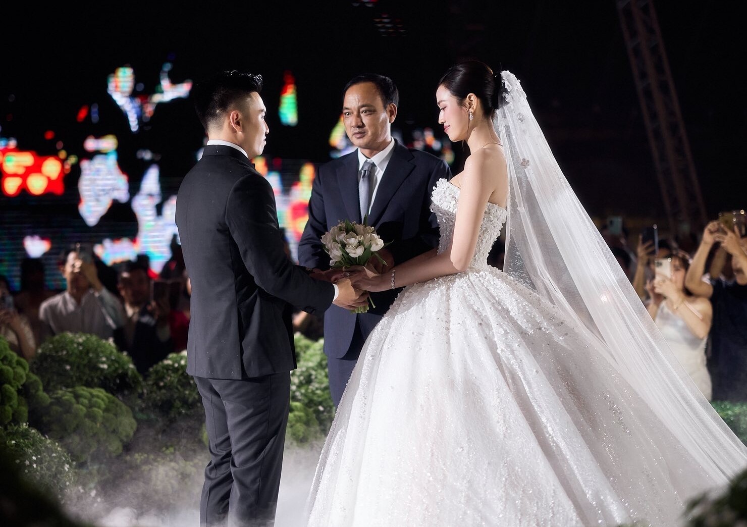 Đến giờ làm lễ, Đỗ Thị Hà được bố ruột dắt lên lễ đường. Khoảnh khắc bố nàng hậu chân đi khập khiễng, chậm rãi dắt ái nữ trao tận tay cho con rể khiến quan khách có mặt xúc động. Đón bà xã, doanh nhân Viết Vương hạnh phúc ôm lấy bố vợ.