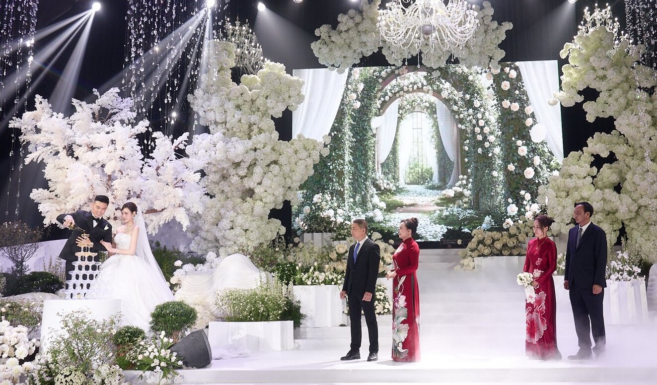 Cặp đôi tay trong tay, bước về sân khấu chính. Sau đó, cả 2 thực hiện trọn vẹn nghi thức trao nhẫn cưới, đọc lời thề nguyện và rót rượu mừng. Trên sân khấu, bố mẹ 2 bên cũng có mặt chứng kiến khoảnh khắc hạnh phúc của 2 con.